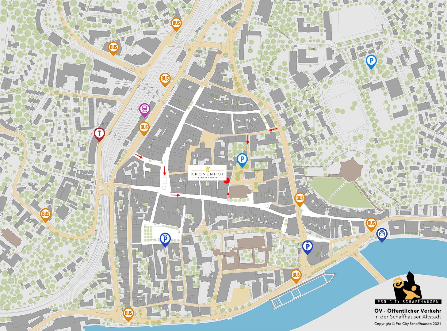 Der Kronenhof liegt unmittelbar in der Fussgängerzone der malerischen Schaffhauser Altstadt. Zahlreiche Shops, Kinos, Restaurants und Bars liegen in unmittelbarer Nähe. Der Rheinfall ist zu Fuss in 40 Minuten oder mit dem Auto in 10 Minuten zu erreichen. Unser Receptionsteam gibt Ihnen gerne Tips um Ihren Aufenthalt mit vielen Eindrücken zu berreichern.